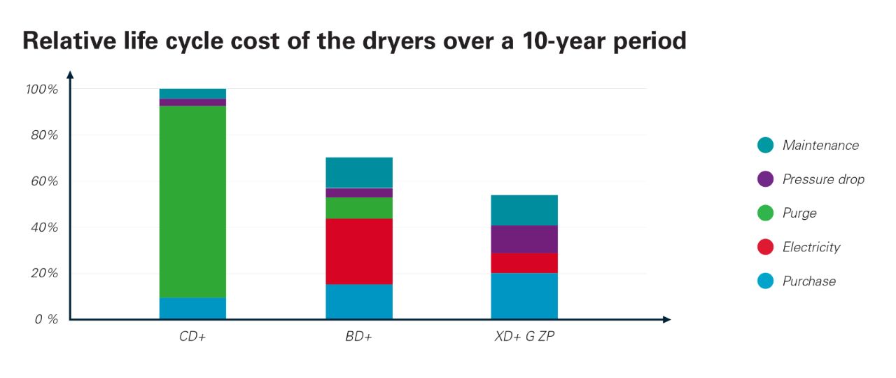BD+ ısıtmalı blower tahliyeli nem çekicili hava kurutucularda harici bir blower’dan alınan ısıtılmış hava ile çok az miktarda basınçlı hava birlikte kullanılır. BD+ nem çekicili hava kurutucular sıfır tahliyeli model olarak da sunulur. CD+ ısı kullanmayan nem çekicili hava kurutucular en basit tiplerdir ve tahliye için yalnızca basınçlı hava kullanarak elektrik bağlantılarını minimuma indirirler. Sıfır tahliyeli soğutmalı XD+, nem çekiciye rejenerasyon yaptırmak için kompresörden geri kazanılan sıkıştırma ısısını kullanır. XD+ kurutucu ısıtma veya soğutma işlemi sırasında basınçlı hava tüketmez.